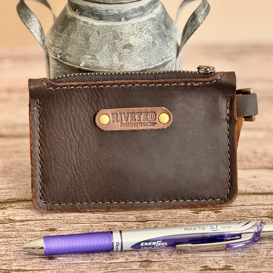 Small little minimalist wallet with a zippered closure to tuck in your boot or pocket
