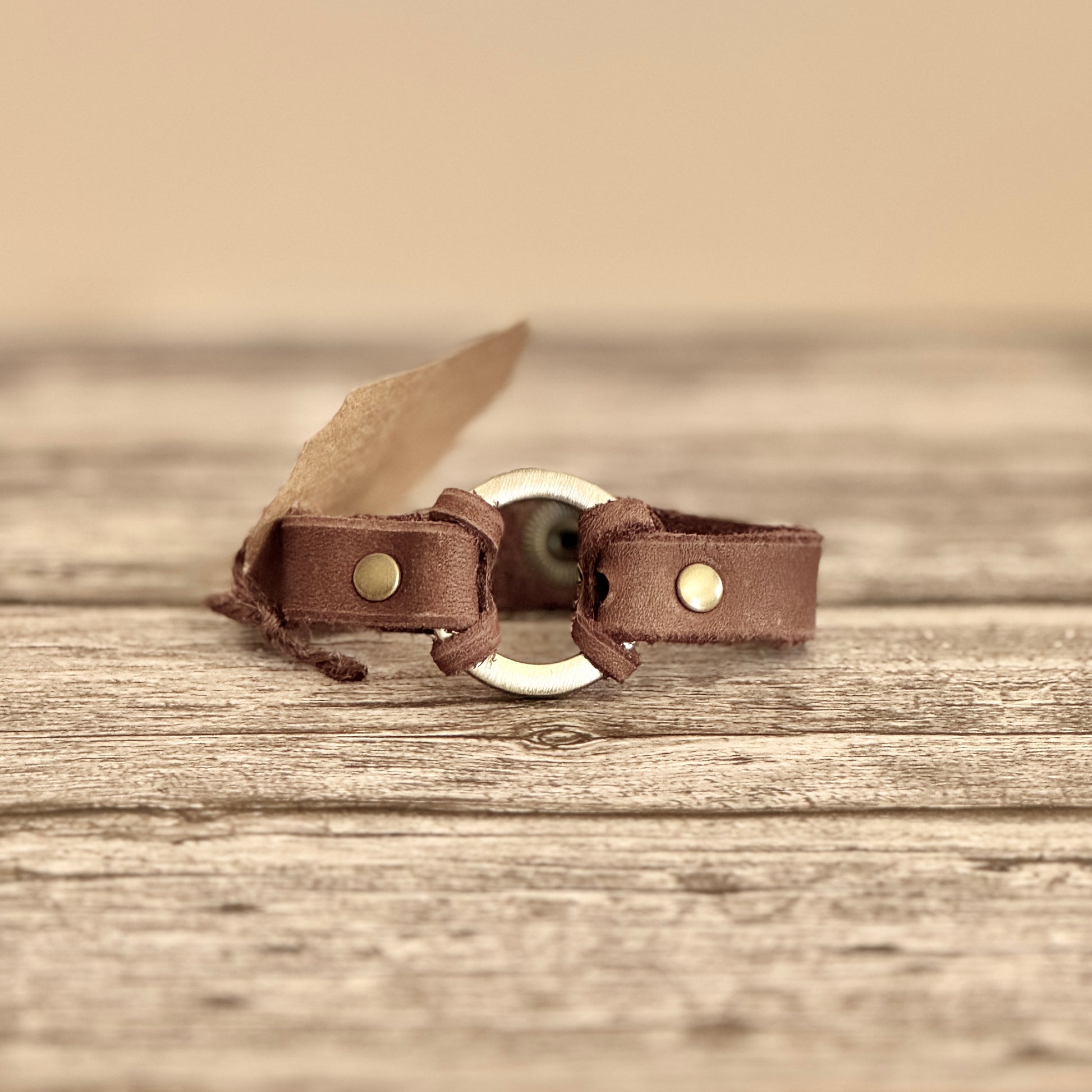 - Soft full-grain leather bracelet with a solid metal decorative ring